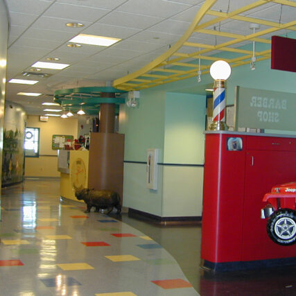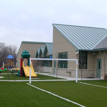 The classrooms had computer stations, carpeted reading areas, and tiled play areas for a complete learning environment. Complete interior design, material, color, and finish selections, and some special furniture designs were also a part of KCA’s scope of work. An artist recommended to KCA was hired to paint full floor-to-ceiling murals depicting school and play themes. KC Architects selected the play/riding equipment and designed the outdoor playground, which included a soccer field, trike paths, and various covered play shelters along with a complete landscape design.